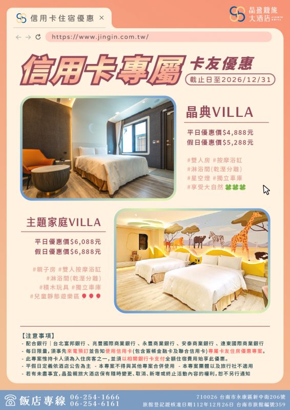 – 每日限量,須事先來電預訂並告知使用信用卡(包含簽帳金融卡及聯合信用卡)專屬卡友住房優惠專案。